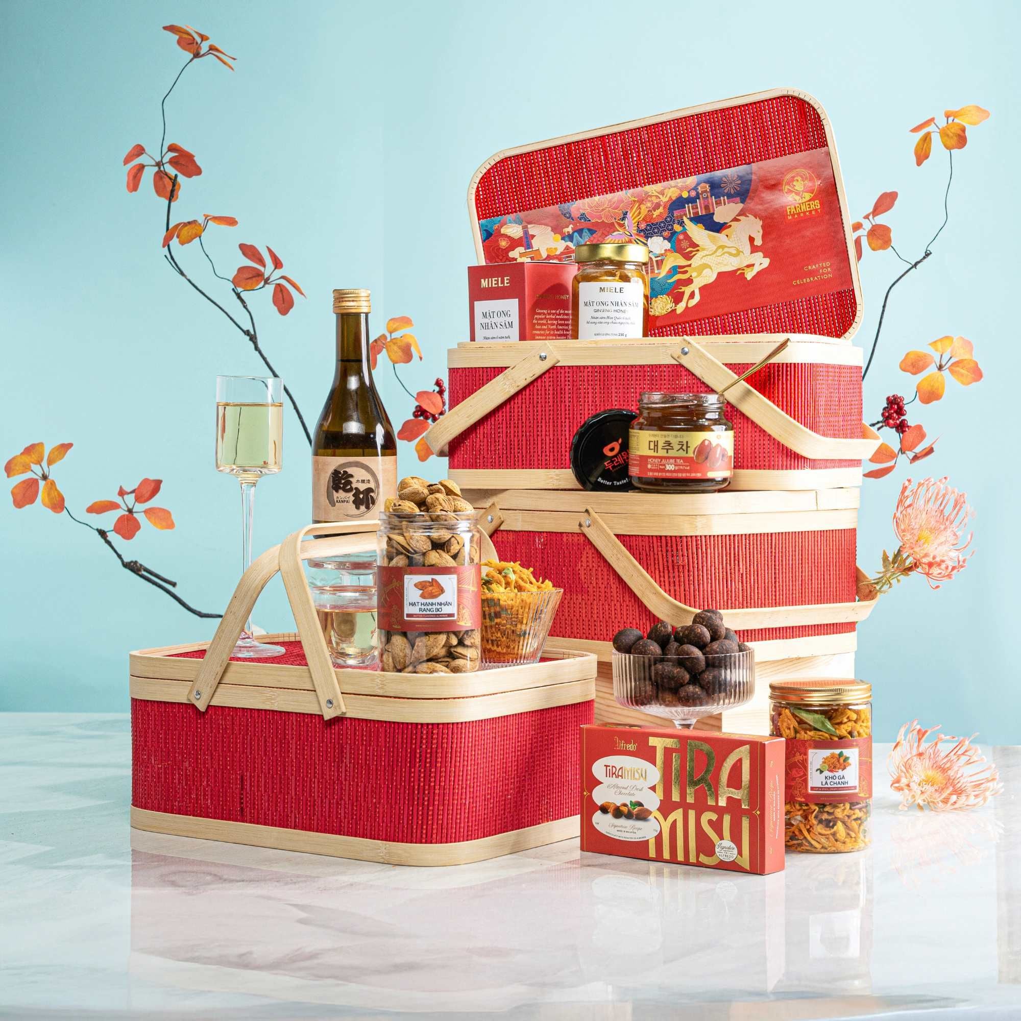 - Farmers Market | Bamboo woven gift box with red handles Tet (31 x 21 x 10cm)