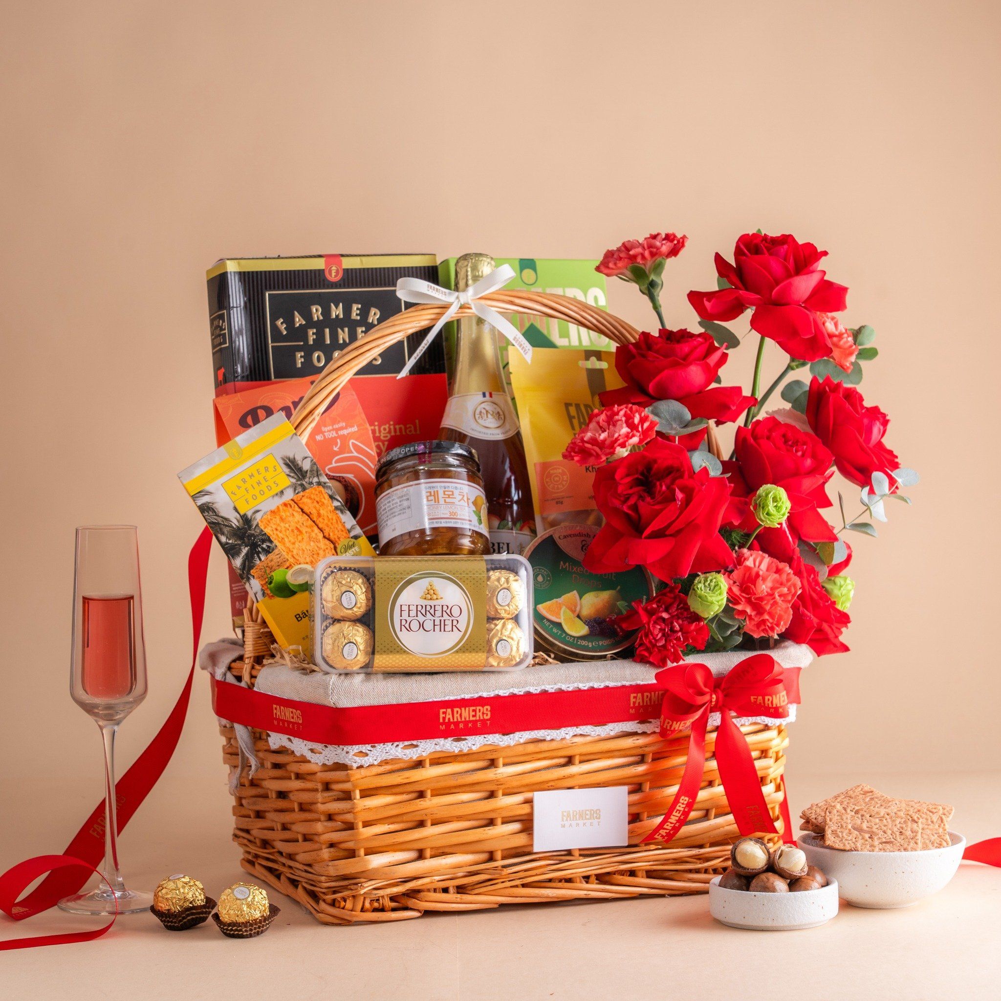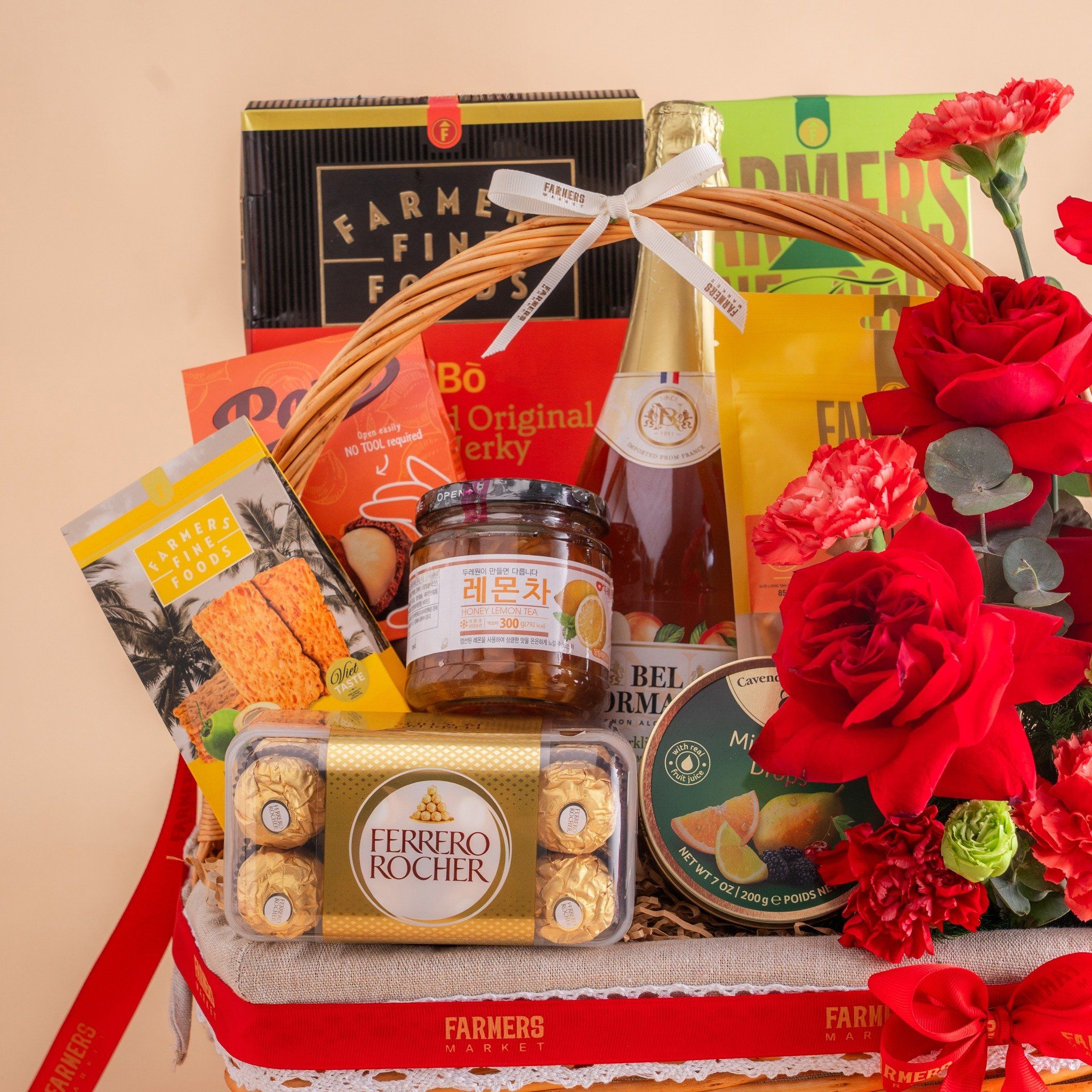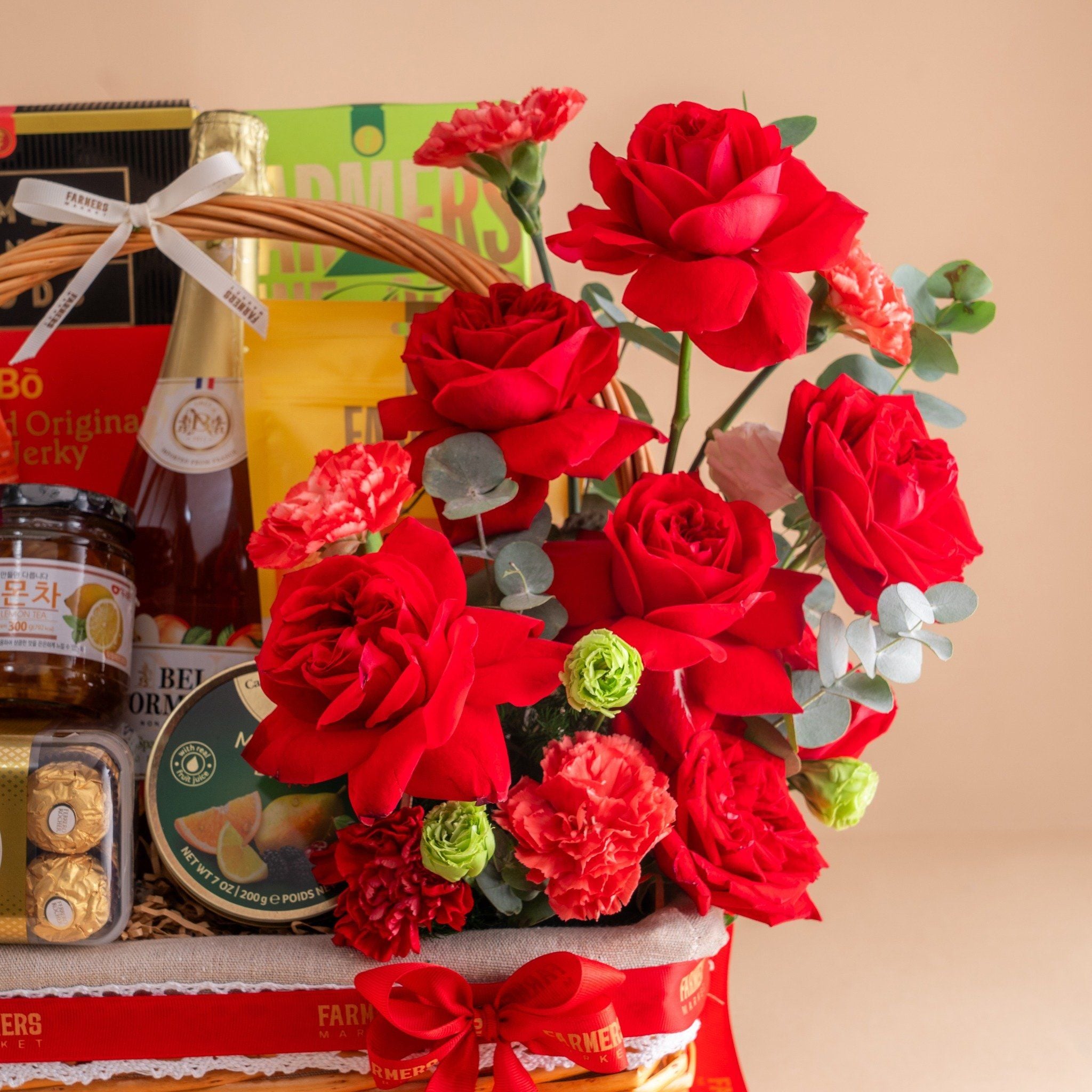 Giỏ Quà Nước Trái Cây - Ăn Vặt Và Hoa Tone Đỏ Tinh Tế