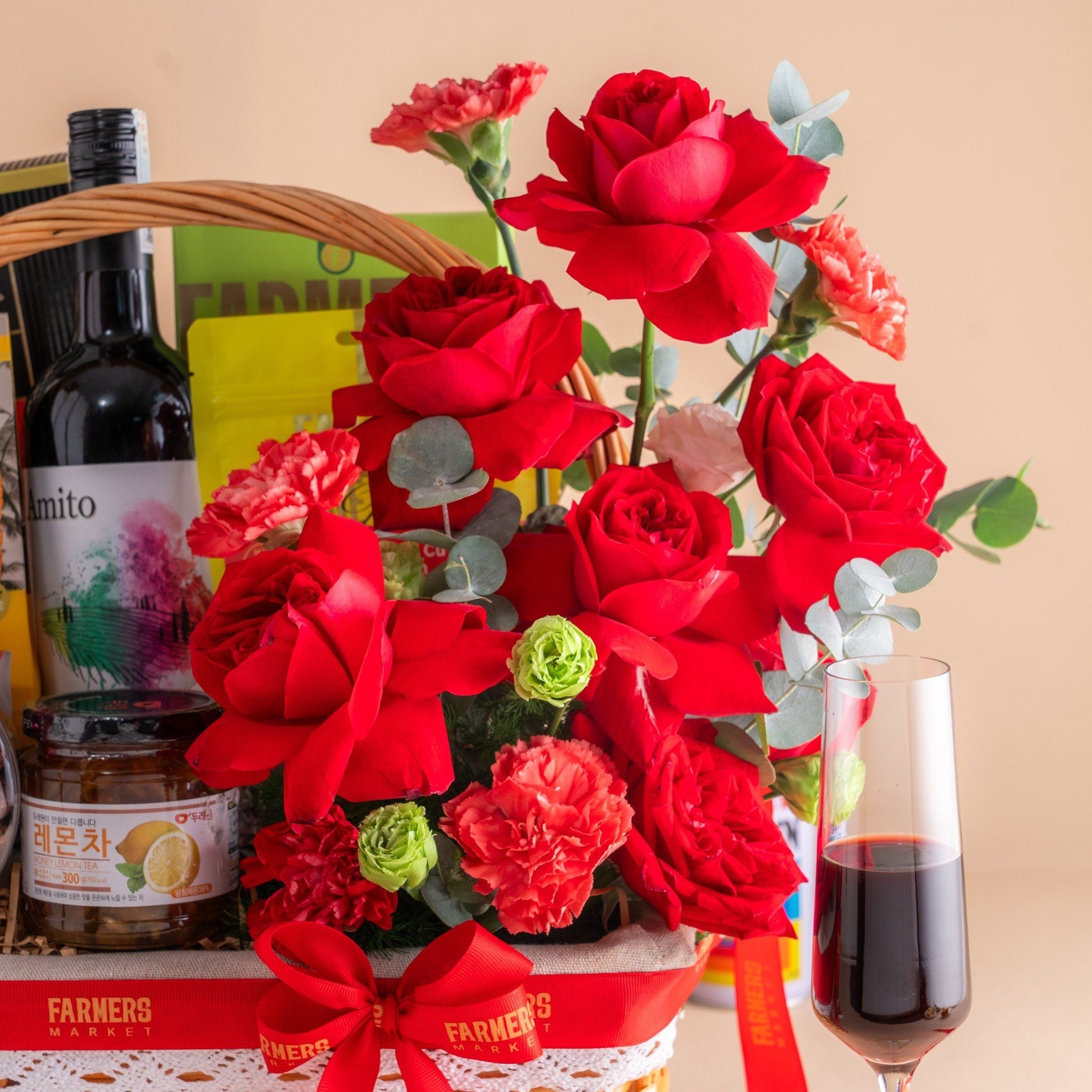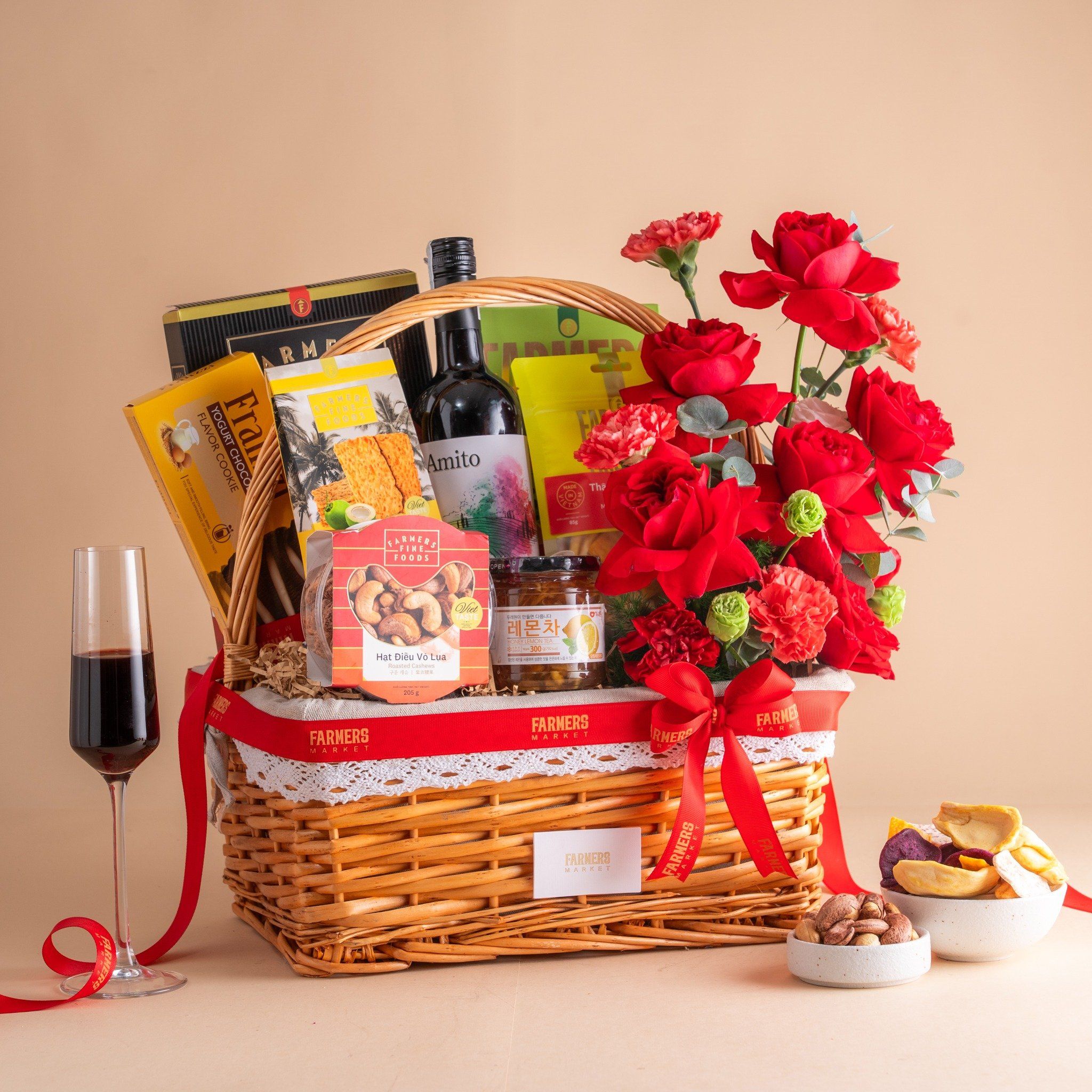 Giỏ Quà Rượu Vang Đỏ - Ăn Vặt Và Hoa Tone Đỏ Thanh Lịch
