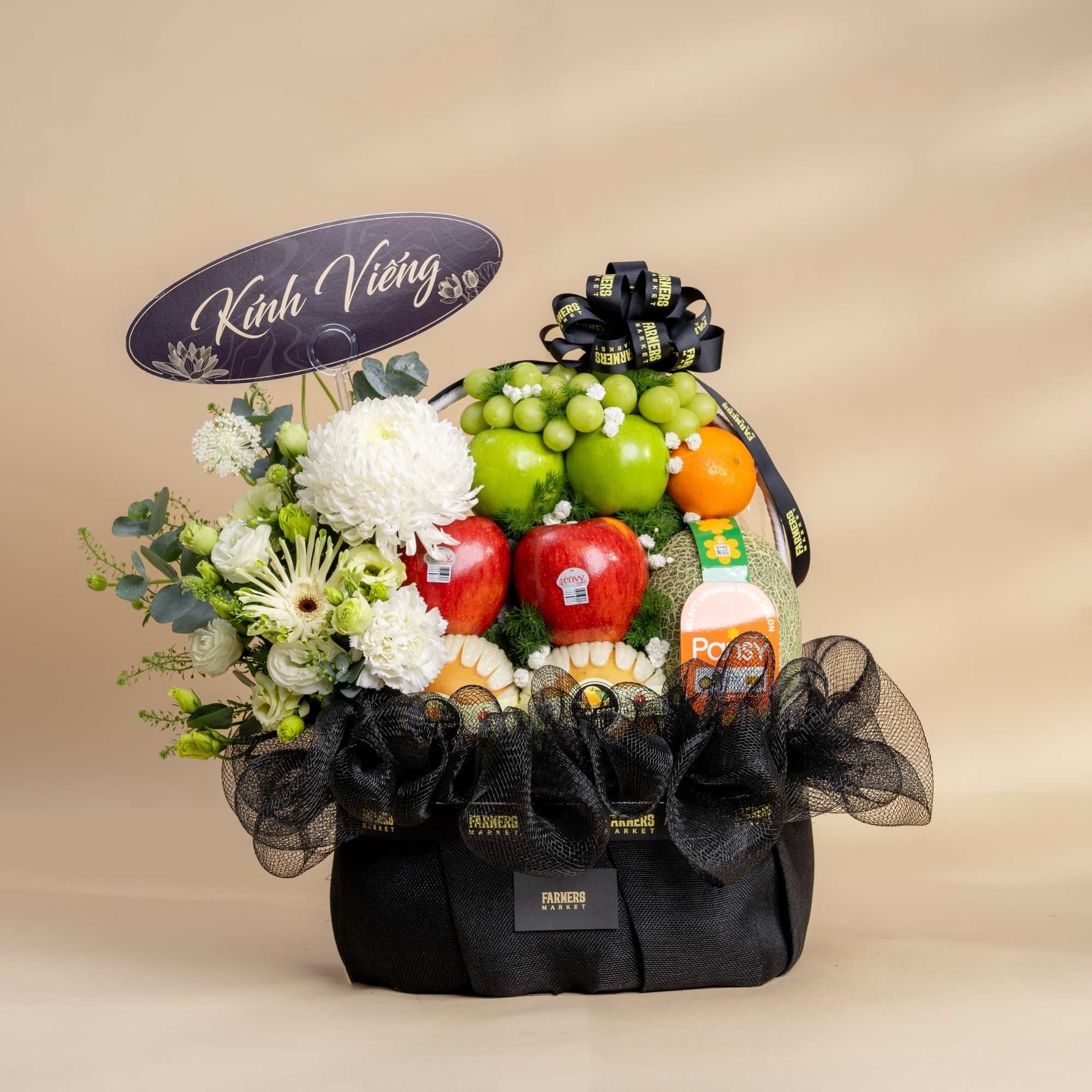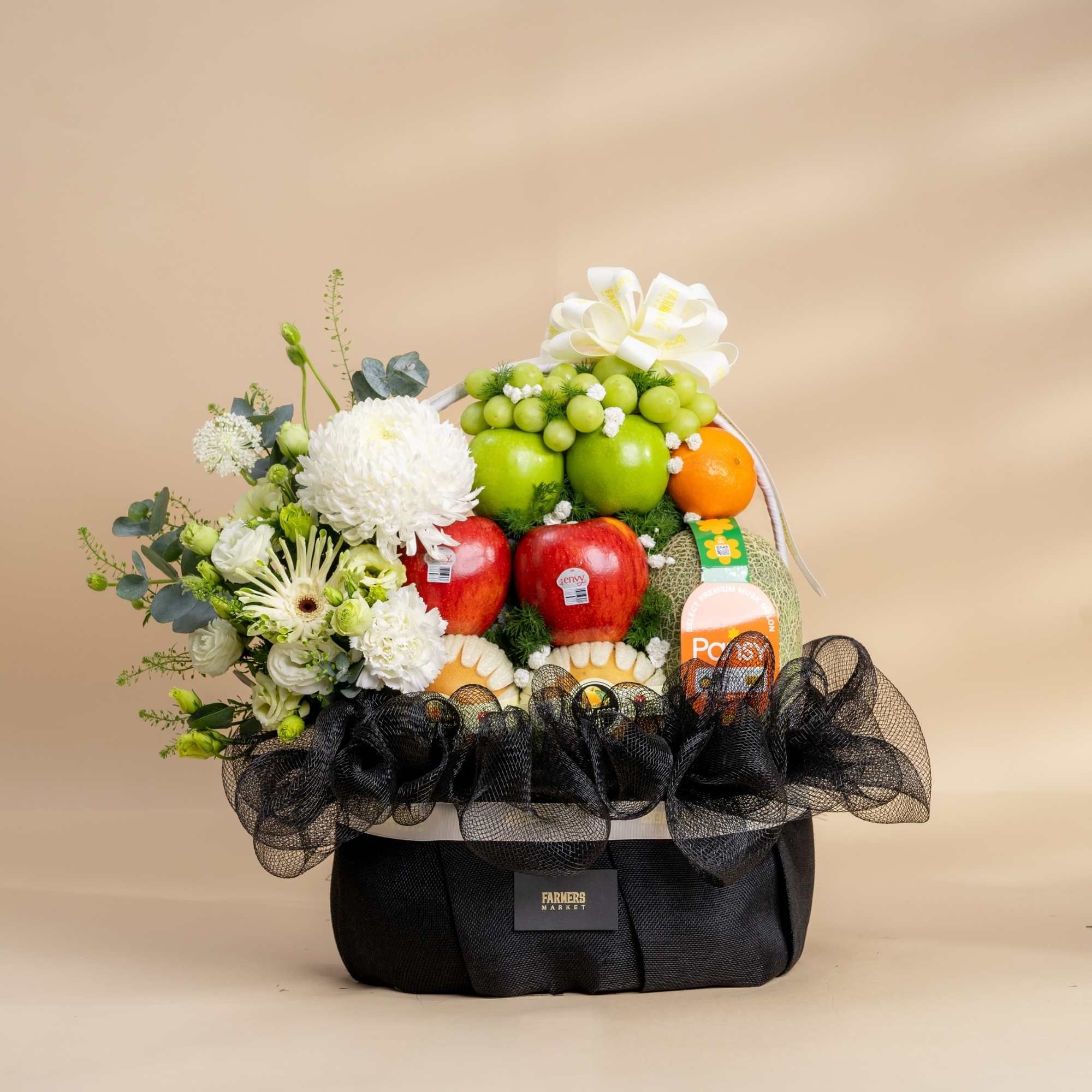 Giỏ Trái Cây Và Cúc Mẫu Đơn Trắng Tone Đen Tinh Tế