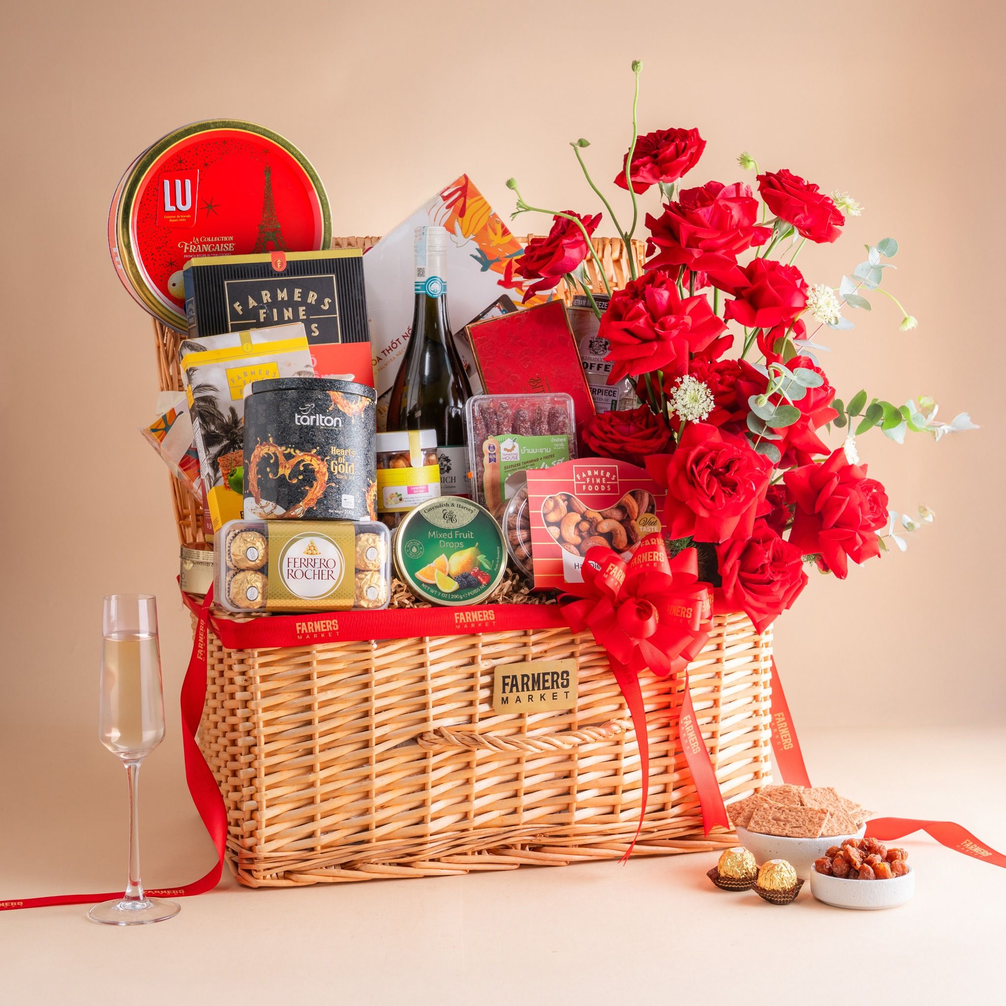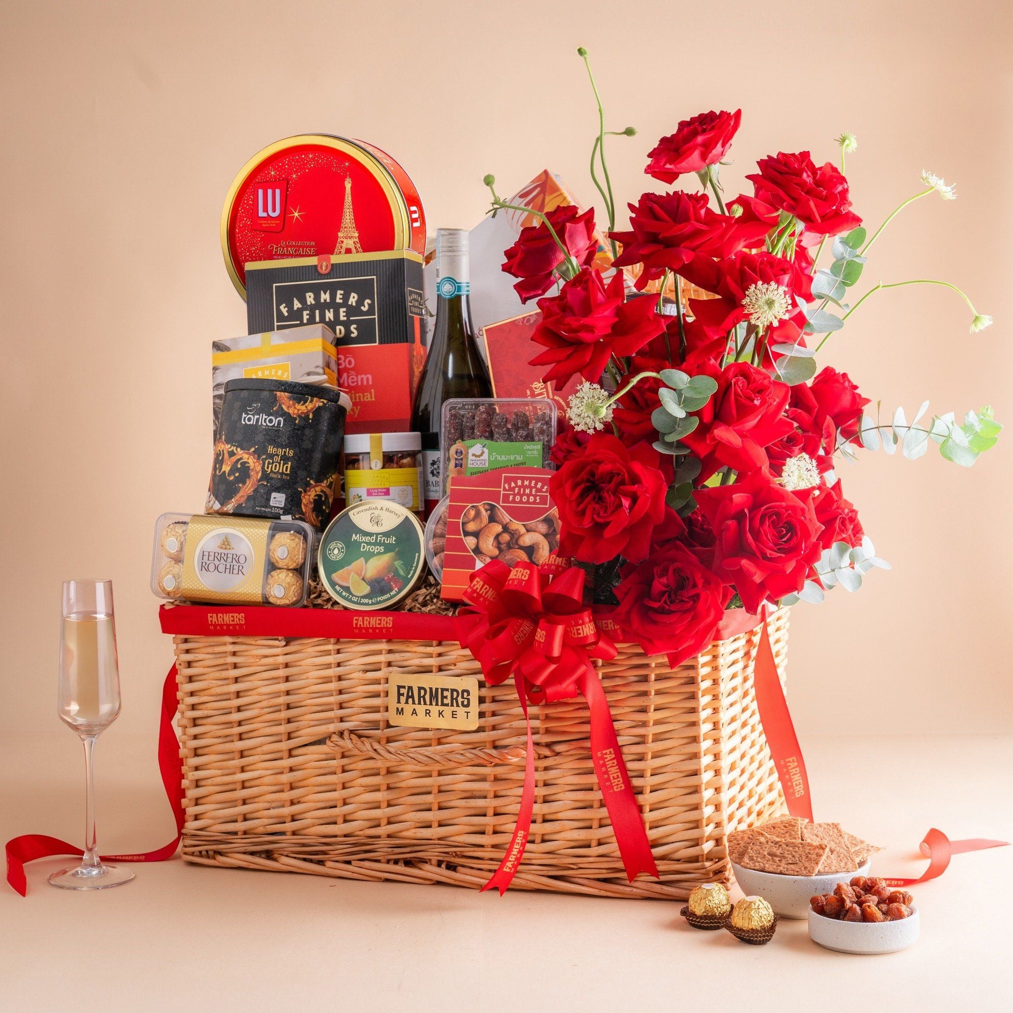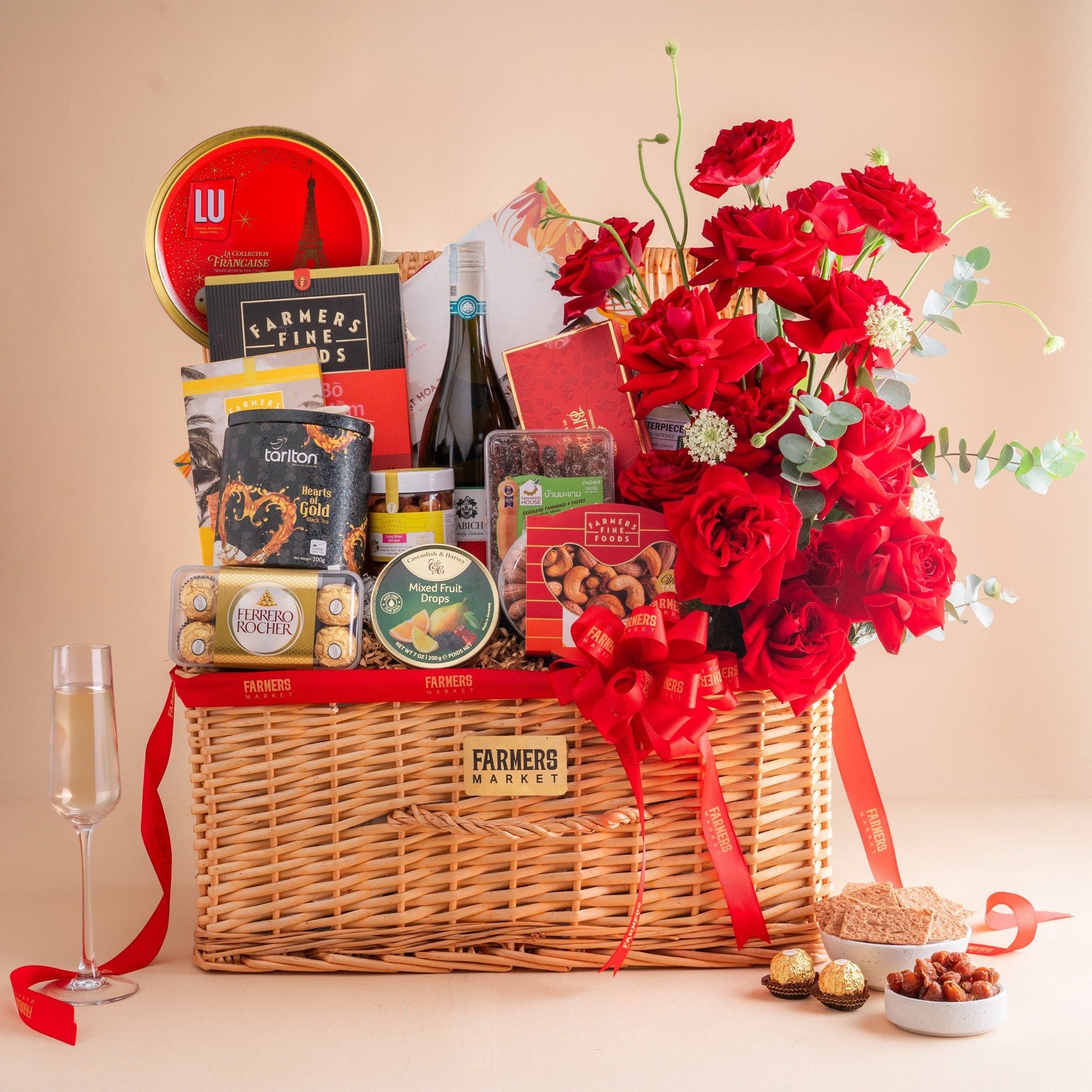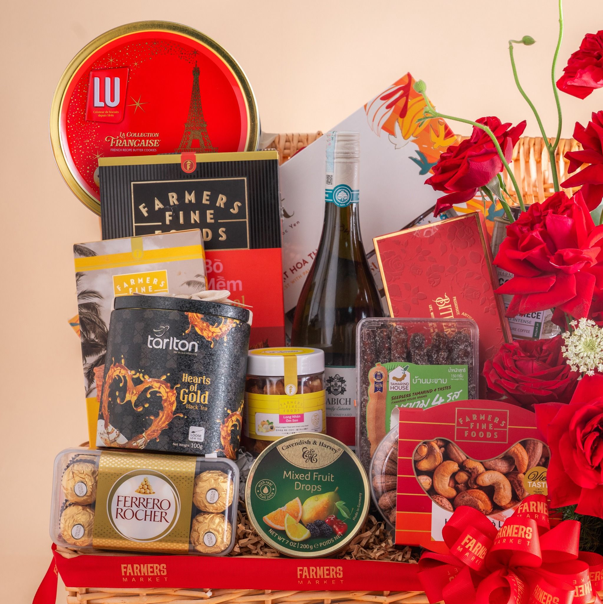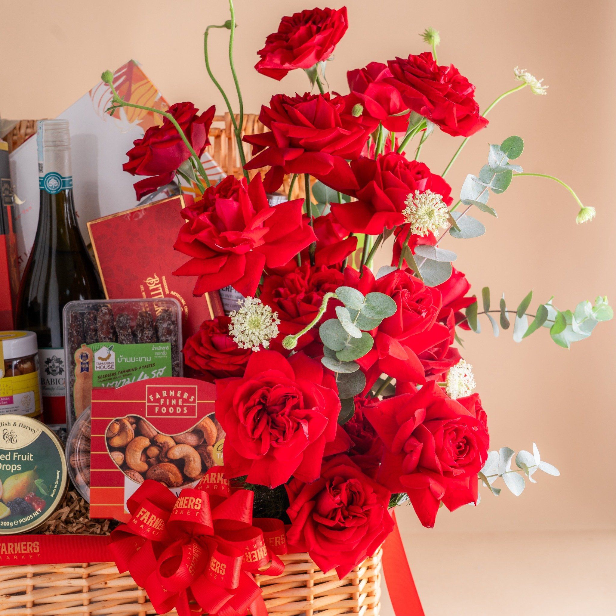 Giỏ Vali Rượu Vang Hữu Cơ - Yến Tươi Và Hoa Tone Đỏ Cao Cấp
